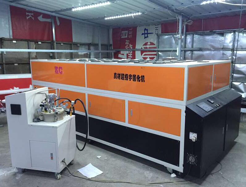 7、灌胶:把弄好的字壳放到固化平台上,用铁块压平,做到字壳边与玻璃之间无缝隙,根据每个笔画所需胶的重量,用打胶机灌入字壳中。检查有无漏胶到字壳外面,发现漏胶的地方加多一块压块,以便固化后好清理。